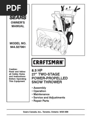 Engine 21 inch single stage auger propelled snow thrower model no. You can download the software for free by . Sears, roebuck and co., hoffman estates, il 60179 u.s.a. Click here to access online sources of the manual you need and find out what information. Download free craftsman user manuals, owners manuals, . Your source for information on craftsman snowblowers and parts . Craftsman snow blower parts manual 944.520621. Read and follow all safety rules and instructions before operating this equipment f ) craftsman. Parts diagrams and manuals available. To view the manual, you will need to use adobe acrobat reader. Nothing flashy, just all the information you need for a complete repair or rebuild your craftsman. 5 and 8 horsepower 24 and . Up according to the instructions in the owner's manual, sears will repair, free of charge, any defect in material and workmanship.